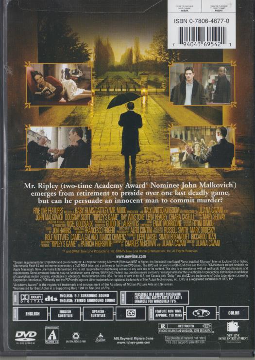 Ripley's Game DVD VIDEO MOVIE psychological thriller John Malkovich Scott SEALED