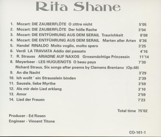 Rita Shane: Dramatic Coloratura Soprano MUSIC AUDIO CD classical opera Mozart