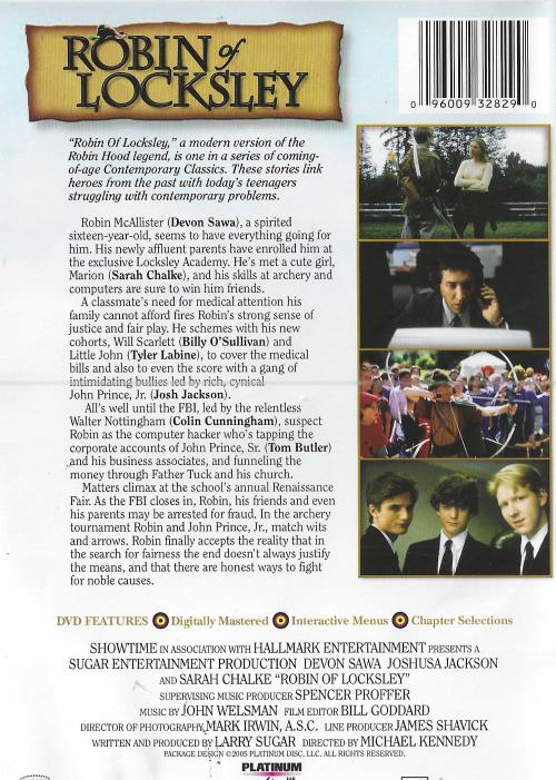"Robin Of Locksley," a modern version of the Robin Hood legend, is one in a series of coming-of-age Contemporary Classics. These stories link heroes from the past with today's teenagers struggling with contemporary problems. Robin McAllister (Devon Sawa), a spirited sixteen-year-old, seems to have everything going for him. His newly affluent parents have enrolled him at the exclusive Locksley Academy. He's met a cute girl, Marion (Sarah Chalke), and his skills at archery and computers are sure to win him friends. A classmate's need for medical attention his family cannot afford fires Robin's strong sense of justice and fair play.