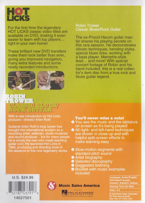 The ex-Procol Harum guitar master shares his playing secrets in this rare session. He demonstrates vibrato techniques, bending styles, special blues licks, working with a bass player, Memphis-style lead and more. With special concert footage of Robin and his band included, this is a real collector's item disc from a true rock and blues guitar legend.