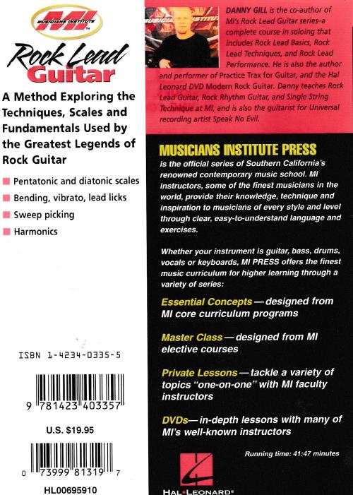 DANNY GILL is the co-author of MI's Rock Lead Guitar series-a complete course in soloing that includes Rock Lead Basics, Rock Lead Techniques, and Rock Lead Performance. He is also the author and performer of Practice Trax for Guitar, and the Hal Leonard DVD Modern Rock Guitar. Danny teaches Rock Lead Guitar, Rock Rhythm Guitar, and Single String Technique at MI, and is also the guitarist for Universal recording artist Speak No Evil. MUSICIANS INSTITUTE PRESS is the official series of Southern California's renowned contemporary music school. Ml instructors, some of the finest musicians in the world, provide their knowledge, technique and inspiration to musicians of every style and level through clear, easy-to-understand language and exercises. Whether your instrument is guitar, bass, drums, vocals or keyboards, Ml PRESS offers the finest music curriculum for higher learning through a variety of series: Essential Concepts — designed from MI core curriculum programs Master Class — designed from Ml elective courses Private Lessons — tackle a variety of topics "one-on-one" with Ml faculty instructors DVDs— in-depth lessons with many of Ml's well-known instructors HAL•LEONAR Running time: 41:47 minutes