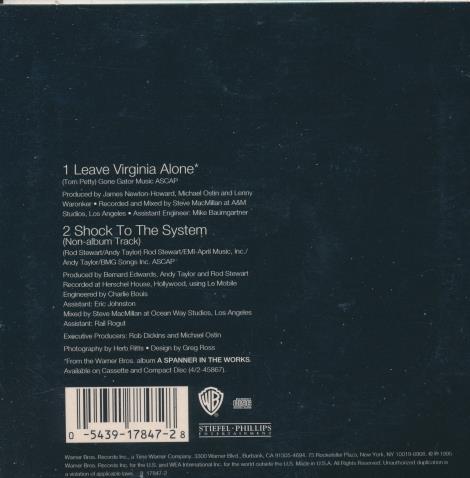 Rod Stewart is a veteran singer known for his distinctive raspy voice and a long career blending rock, pop and adult contemporary styles. This release is a single release of "Leave Virginia Alone," a song written by Tom Petty, and ties into the Warner Bros. album A SPANNER IN THE WORKS. The single mixes polished studio production with soulful vocal delivery typical of his 1990s work. The material here sits between mainstream pop rock and mature adult contemporary arrangements.