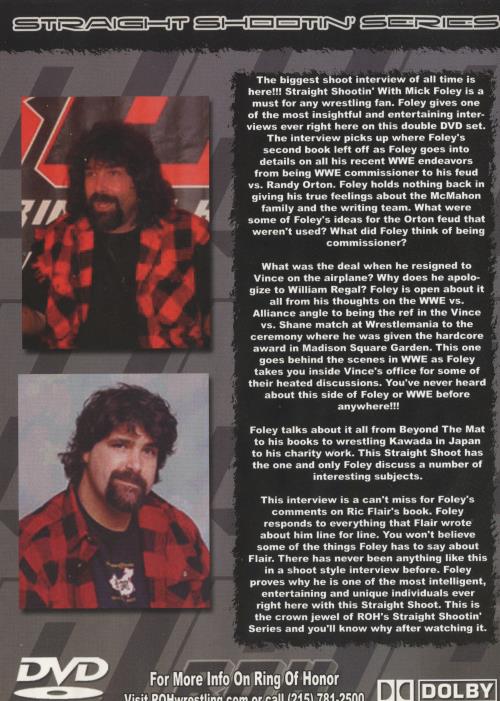 This interview is a can't miss for Foley's comments on Ric Flair's book. Foley responds to everything that Flair wrote about him line for line. You won't believe some of the things Foley has to say about Flair. There has never been anything like this in a shoot style interview before. Foley proves why he is one of the most intelligent, entertaining and unique individuals ever right here with this Straight Shoot. This is the crown jewel of ROH's Straight Shootin' Series and you'll know why after watching it.