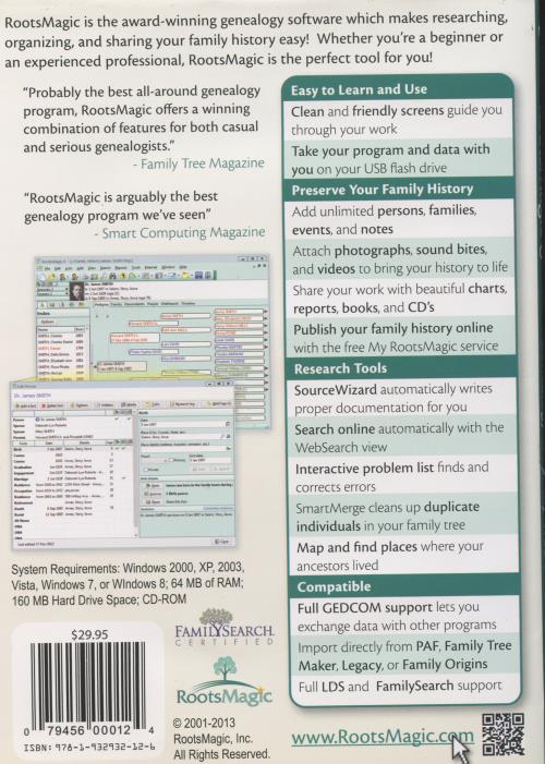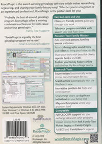 RootsMagic 6 is the version of the award-winning genealogy software that makes researching, organizing, and sharing your family history easy! Having won the award for "Easiest to Sync" with FamilySearch, RootsMagic allows you to search for your ancestors online, share information that you have, and even find and reserve incomplete temple work. Whether you're a beginner or an experienced professional, RootsMagic is the perfect tool for you!