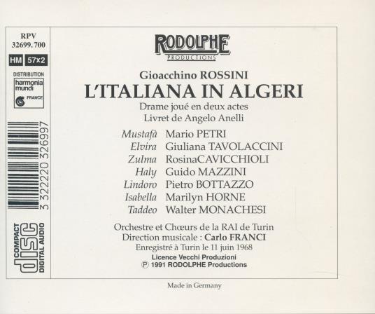 Gioacchino Rossini - Marilyn Horne, Mario Petri, Pietro Bottazzo, Orchestra Sinfonica Di Torino Della RAI Et Coro Di Torino Della RAI, Carlo Franci: L'Italiana In Algeri