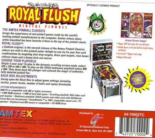 Royal Flush Digital Pinball is a simulation of the classic 1974 Gottlieb pinball game, Royal Flush. It was developed for the PC by Amtex and distributed by GT Interactive. Royal Flush Digital Pinball is set up like a basic pinball machine. The player controls two flippers on either side of the playing field and the spring loaded launch mechanism that hurls the silver ball onto the playing surface. Royal Flush Digital Pinball also allows players to nudge machine using the Z key on the keyboard.