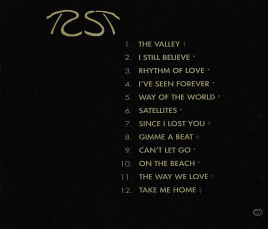 1 . THE VALLEY 2. I STILL BELIEVE RHYTHM OF LOVE .4. I'VE SEEN FOREVER 5. WAY OF THE WORLD - 6. SATELLITES 7. SINCE I LOST YOU 8. GIMME A BEAT 9. CAN'T LET GO 10. ON THE BEACH . 1 1 . THE WAY WE LOVE 12. TAKE ME HOME