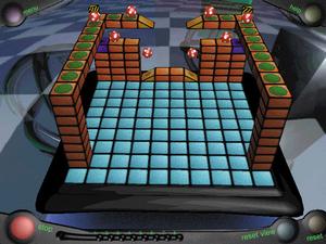 "Rubik's Playground" -- The purpose of this game is to guide a designated number of balls into a hole. To do so, you must roll your balls so that any obstacles in the way cannot harm them or keep them from reaching the destination. Different balls react in their own way: lightweight rubber balls bounce and are quick, but can be destroyed by spikes; plastic balls are quick, light and unaffected by spikes, but don't bounce well; heavy iron balls are unaffected by spikes, but are slow and can be pulled in by magnets; and medium-weight bombs do not bounce, and they explode upon impact with anything but inside edges and corners. You often have a set of given ramps and blocks which must be placed properly in order to succeed.