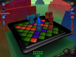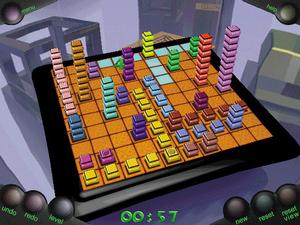 "Cover Up" -- A 3D gridded surface presents itself in this game, with several differently sized "towers" of colored tiles placed on certain grids. It's your job to pick up the tiles and lay them in such a way so that every square on the surface is filled. It's not as easy as it sounds, though. The tiles can only be placed so that they vertically or horizontally still connect with the tower from which they originated. As a result, tiles of one color might block the path of another set. Size of the grid is adjustable to vary up the challenge.