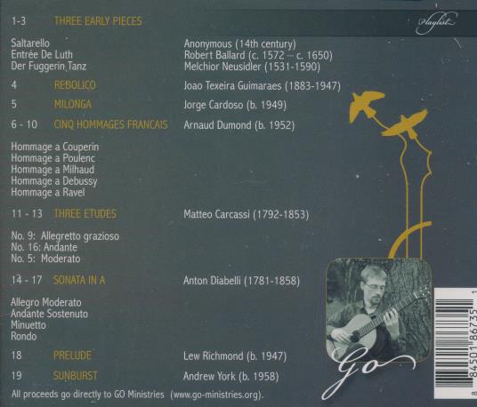 Ryan Apple is a classical guitarist who performs a wide range of repertoire from early lute pieces to contemporary compositions. On Go he interprets works spanning centuries, including anonymous medieval dances, classical sonatas, and modern compositions by Andrew York and Lew Richmond. His playing emphasizes clarity of voice leading, expressive phrasing, and thoughtful interpretation. Proceeds from the album benefit GO Ministries.
