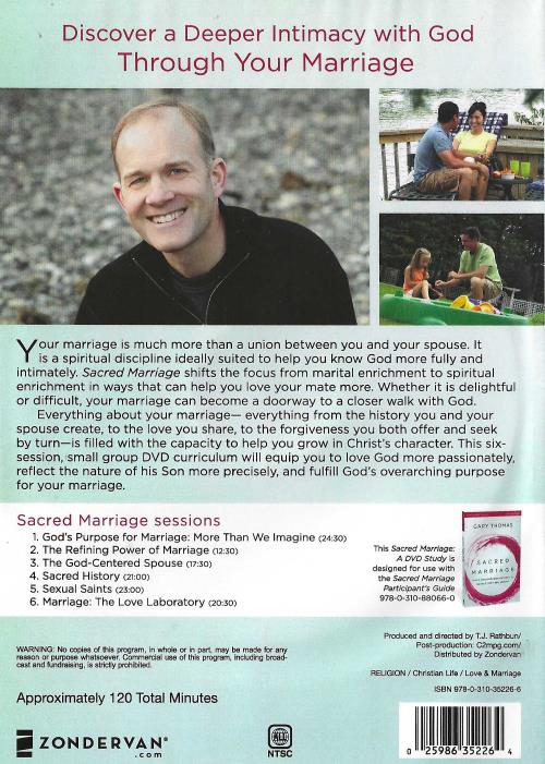 Discover a Deeper Intimacy with God Through Your Marriage our marriage is much more than a union between you and your spouse. It I is a spiritual discipline ideally suited to help you know God more fully and intimately. Sacred Marriage shifts the focus from marital enrichment to spiritual enrichment in ways that can help you love your mate more. Whether it is delightful or difficult, your marriage can become a doorway to a closer walk with God. Everything about your marriage— everything from the history you and your spouse create, to the love you share, to the forgiveness you both offer and seek by turn—is filled with the capacity to help you grow in Christ's character. This six-session, small group DVD curriculum will equip you to love God more passionately, reflect the nature of his Son more precisely, and fulfill God's overarching purpose for your marriage. Sacred Marriage sessions 1. God's Purpose for Marriage: More Than We Imagine (24:30) 2. The Refining Power of Marriage (12:30) 3. The God-Centered Spouse (17:30) 4. Sacred History (21:00) 5. Sexual Saints (23:00) 6. Marriage: The Love Laboratory (20:30)