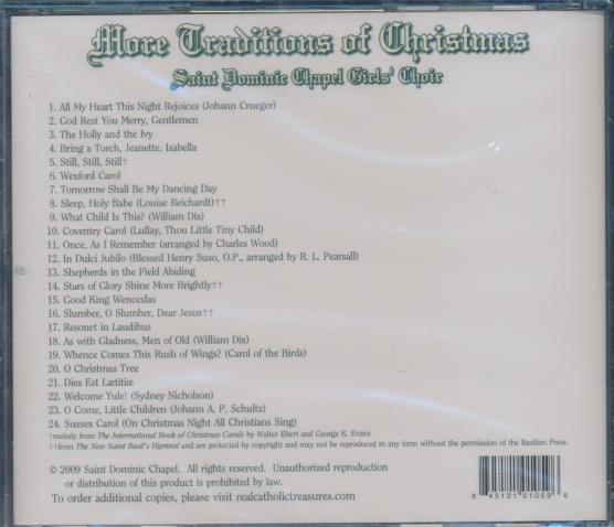 Saint Dominic Chapel Girls' Choir is a liturgical girls' choir that performs sacred and traditional Christmas repertoire. This album, More Traditions of Christmas, presents a selection of classic carols and hymns drawn from historical and hymnbook sources. The performances feature clear, traditional choral harmonies and a devotional emphasis appropriate for chapel settings. The program ranges from medieval and renaissance carols to well-loved seasonal hymns arranged for a girls' choir.