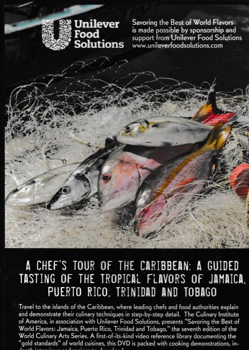 A CHEF'S TOUR OF THE CARIBBEAN: A GUIDED TASTING OF THE TROPICAL FLAVORS OF JAMAICA, PUERTO RICO, TRINIDAD AND TOBAGO Travel to the islands of the Caribbean, where leading chefs and food authorities explain and demonstrate their culinary techniques in step-by-step detail. The Culinary Institute of America, in association with Unilever Food Solutions, presents "Savoring the Best of World Flavors: Jamaica, Puerto Rico, Trinidad and Tobago," the seventh edition of the World Culinary Arts Series. A first-of-its-kind video reference library documenting the "gold standards" of world cuisines, this DVD is packed with cooking demonstrations, in-depth interviews and recipes to download.