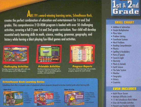 School House Rock! 1st & 2nd Grade Essentials includes two years of basic skill development, original "School House Rock!" video clips, and a print section filled with non-computer games, puzzles, arts & crafts and science experiments. With two CDs and three widely varied levels of play, it provides inquisitive young students with many hours of fun, exploration and learning