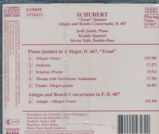 This Naxos release presents Franz Schubert's chamber works performed by pianist Jenő Jandó with the Kodály Quartet and double-bassist István Tóth. The programme pairs the Piano Quintet in A major, D.667 "Trout" with the Adagio and Rondo Concertante in F, D.487. The performances are lyrical and finely balanced, emphasizing Classical-era clarity alongside Romantic expressiveness. The recording was made in December 1991 in Budapest and captures an intimate, warm chamber sound.