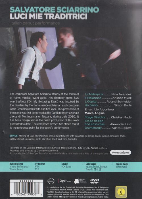 The composer Salvatore Sciarrino stands at the forefront of Italy's musical avant-garde. His chamber opera Luci mie traditrici 'Oh My Betraying Eyes' was inspired by the murders by the Renaissance nobleman and composer Carlo Gesualdo of his wife and her lover. This production of the opera was first performed at the Cantiere Internazionale d'Arte di Montepulciano, Tuscany, during July 2010. It has been recognized as one of the finest productions of this work presented to date. The composer himself has stated that it is the reference point for the opera's performance.