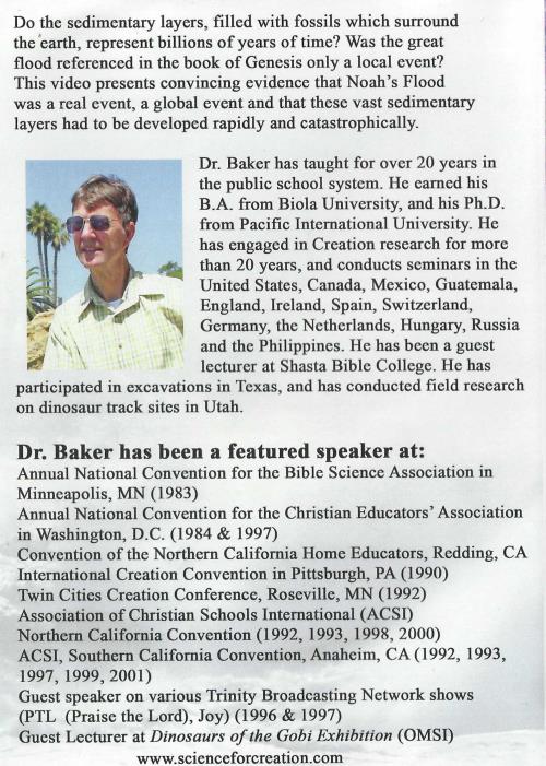 Do the sedimentary layers, filled with fossils which surround the earth, represent billions of years of time? Was the great flood referenced in the book of Genesis only a local event? This video presents convincing evidence that Noah's Flood was a real event, a global event and that these vast sedimentary layers had to be developed rapidly and catastrophically. Dr. Baker has taught for over 20 years in the public school system. He earned his B.A. from Biola University, and his Ph.D. from Pacific International University. He has engaged in Creation research for more 4141 than 20 years, and conducts seminars in the United States, Canada, Mexico, Guatemala, England, Ireland, Spain, Switzerland, Germany, the Netherlands, Hungary, Russia and the Philippines. He has been a guest lecturer at Shasta Bible College. He has participated in excavations in Texas, and has conducted field research on dinosaur track sites in Utah.