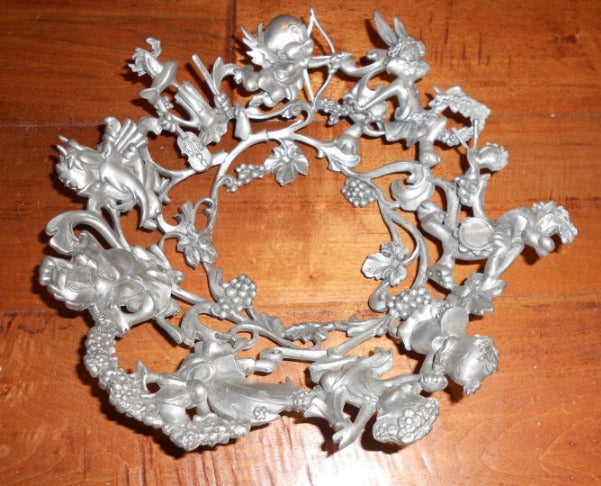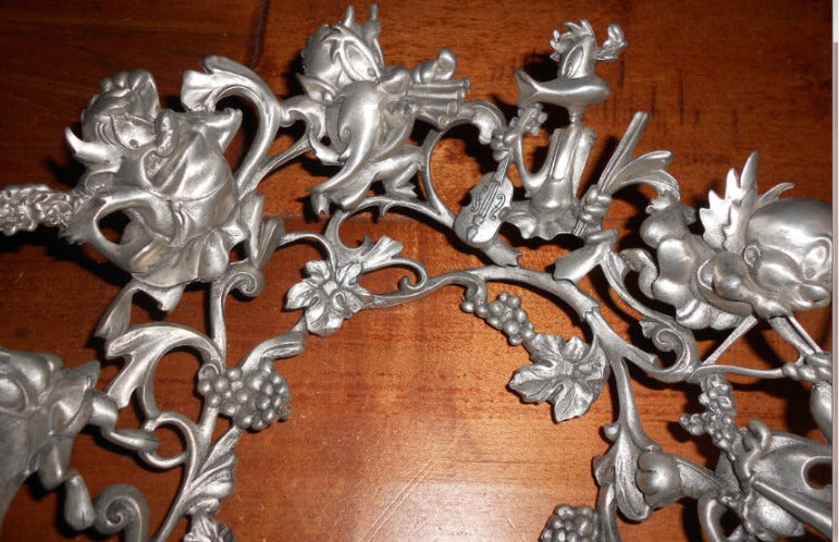 10.5 diameter ring of Seagull Pewter Looney Tunes characters including Bugs Bunny, Tanzanian Devil, Porky Pig, Petunia Pig, Sylvester the Cat, Tweety Bird, Elmer Fudd, Daffy Duck, Pepe LePew, and Yosemite Sam. They are all here!