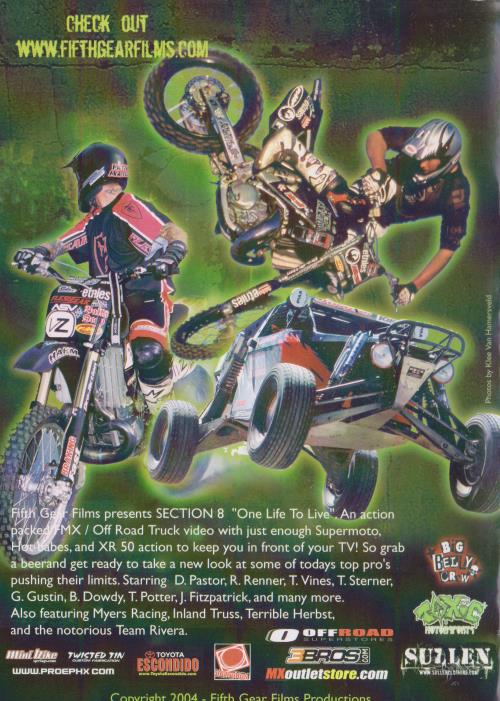 Section 8: One Life To LiveAn action MX / Off Road Truck video with just enough Supermoto, es, and XR 50 action to keep you in front of your TV! So grab a beerand get ready to take a new look at some of todays top pro's pushing their limits. Starring D. Pastor, R. Renner, T. Vines, T. Sterner, G. Gustin, B. Dowdy, T. Potter, J. Fitzpatrick, and many more. Also featuring Myers Racing, Inland Truss, Terrible Herbst, and the notorious Team Rivera.