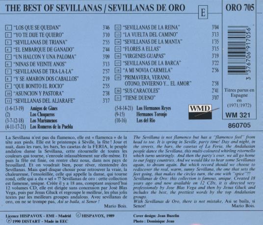 La Sevillana is not flamenco but has a 'flamenco feel' from head to toe. It is spring in Seville, party time! Day and night, in the streets, the bars, the casetas of La Feria, the Andalucian people dance the Sevillana, this multi-coloured whirling rittermühle which turns untiringly. And the word 'party' over, we all go home to our foggy countryside. And we would like to hear some Sevillanas again, to dream again. But which record should we choose to discover the real, warm, sunny Sevillana, the one that sets the feet going that makes the circles turn, the one with 'spice'? Sevillanas de Oro: this collection is famous, unique.