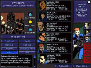 Action in Shadow Watch is from a top-down isometric perspective and the game supports both point-and-click and keyboard command control. Victory conditions for each mission or campaign vary but must be met fully in order to complete the action. There are three levels of difficulty available, easy, normal and hard, and each has very specific parameters in terms of gameplay. Mission failure is guaranteed if any one of the six characters is killed, an alarm is set off during a surveillance or theft mission or if a hostage is killed during a kidnap or rescue mission.