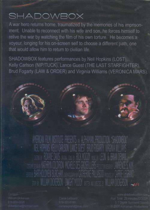 A war hero returns home, traumatized by the memories of his imprisonment. Unable to reconnect with his wife and son, he forces himself to relive the war by watching the film of his own torture. He becomes a voyeur, longing for his on-screen self to choose a different path, one that would allow him to return to civilian life. SHADOWBOX features performances by Neil Hopkins (LOST), Kelly Carlson (NIP/TUCK), Lance Guest (THE LAST STARFIGHTER), Brud Fogarty (LAW & ORDER) and Virginia Williams (VERONICA MARS). Short Film 23m