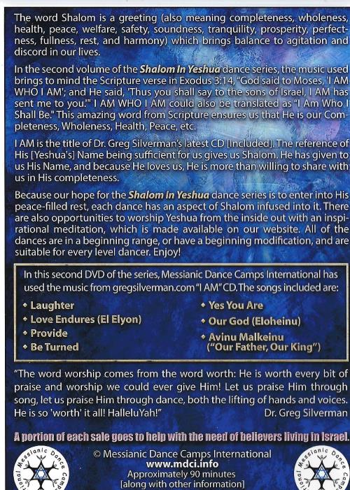 This amazing word from Scripture ensures us that He is our Corn- Pl-pleteness, Wholeness, Health, Peace, etc. 10 I AM is the title of Dr. Greg Silverman's lateSt CD c 1V se•„sreference of His [Yeshua's] Name being sufficient for us gives us Shalom. He has given to us His Name, and because He loves us, He is more than willing to share with us in His completeness. Because our hope for the Shalom In Yeshua dance series is to enter into His peace-filled rest, each dance has an aspect of Shalom infused into it. There are also opportunities to worship Yeshua from the inside out with an inspi-rational meditation, which is made available on our website. All of the dances are in a beginning range, or have a beginning modification, and are suitable for every level dancer. Enjoy!