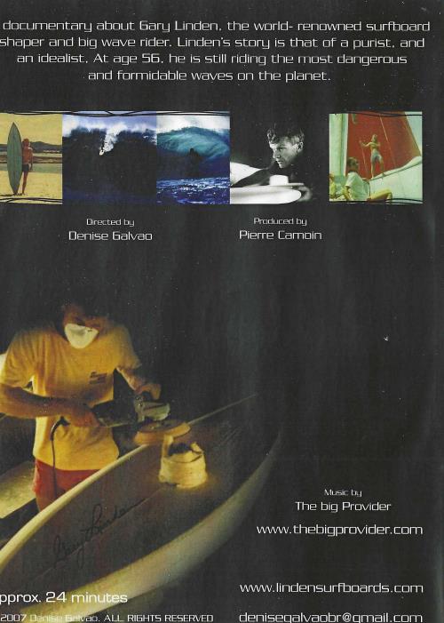 A documentarg about Barg Linden. the world- renowned surfboard -- shaper and big wave rider. Linden's story is that of a purist, and an idealist. At age 55. he is still riding the most dangerous and formidable waves on the planet. -TE 4.1e Directed by Denise Galva] Produced bij Pierre Camoin pprox. 24 mingtes
