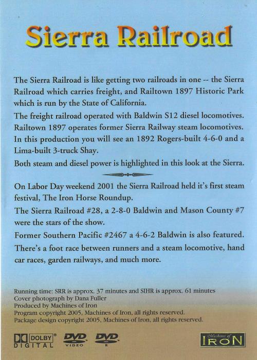 The Sierra Railroad is like getting two railroads in one -- the Sierra Railroad which carries freight, and Railtown 1897 Historic Park which is run by the State of California. The freight railroad operated with Baldwin S12 diesel locomotives. Railtown 1897 operates former Sierra Railway steam locomotives. In this production you will see an 1892 Rogers-built 4-6-0 and a Lima-built 3-truck Shay. Both steam and diesel power is highlighted in this look at the Sierra. On Labor Day weekend 2001 the Sierra Railroad held it's first steam festival, The Iron Horse Roundup. The Sierra Railroad #28, a 2-8-0 Baldwin and Mason County #7 were the stars of the show. Former Southern Pacific #2467 a 4-6-2 Baldwin is also featured. There's a foot race between runners and a steam locomotive, hand car races, garden railways, and much more. Running time: SRR is approx, 37 minutes and SIHR is approx. 61 minutes