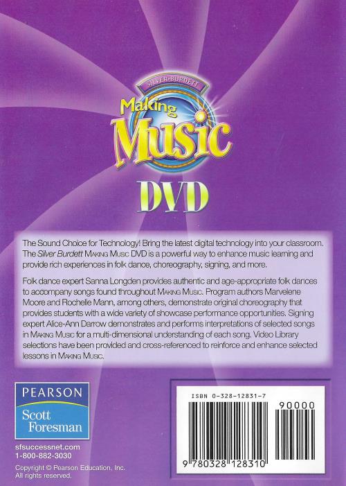 The Sound Choice for Technology! Bring the latest digital technology into your classroom. The Silver Burdett MAKING MUSIC DVD is a powerful way to enhance music learning and provide rich experiences in folk dance, choreography, signing, and more. Folk dance expert Sanna Longden provides authentic and age-appropriate folk dances to accompany songs found throughout MAKING Music, Program authors Marvelene Moore and Rochelle Mann, among others, demonstrate original choreography that provides students with a wide variety of showcase performance opportunities. Signing expert Alice-Ann Darrow demonstrates and performs interpretations of selected songs in MAKING Music for a multi-dimensional understanding of each song. Video Library selections have been provided and cross-referenced to reinforce and enhance selected lessons in WING Music.