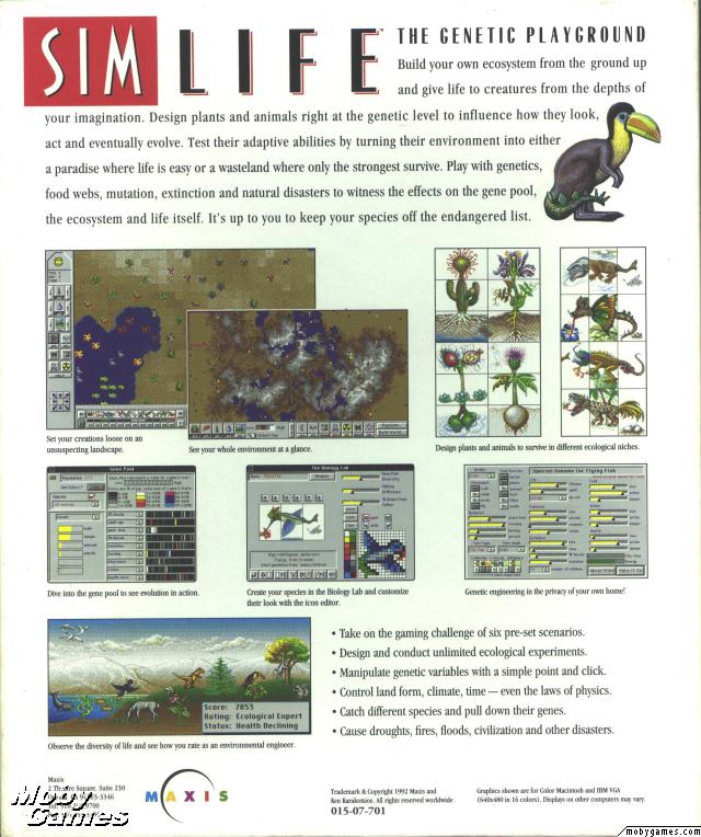 The producers of SimLife refer to it as "The Genetic Playground." The game allows users to explore the interaction of life-forms and environments. Users can manipulate the genetics of both plants and animals to determine whether these new species could survive in the Earth's various environments. Players can also create new worlds with distinctive environments to see how certain species (earth's species or their own) fare within them.