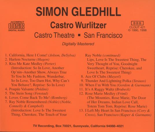 SIMON GLEDHILL: CASTRO WURLITZER: CALIFORNIA HERE I COME
