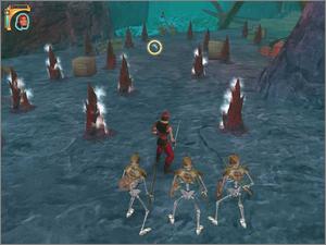 Power-ups grant players the ability to turn invisible for a short time or to summon a group of skeletons to fight alongside Sinbad. The swashbuckling sailor can also perform a variety of acrobatic moves to help him advance through the 3D locales or to assist in defeating enemies. Film director Patrick Gilmore helped collaborate with the development team at Small Rockets to ensure the scenes and storyline were faithful adaptations of DreamWorks' summer movie.