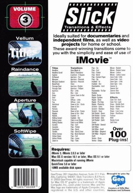 Slick Transitions and Effects are the premier plug-ins available for iMovie. The suite of plug-ins provide you with dozens of new tools to spice up your iMovies, while preserving iMovie's simplicity and ease of use. Volume Three includes over 100 new plug-ins, including 30 titles to punctuate your movies, state-of-the-art page curls, aperture blends, ripples, and soft wipes.