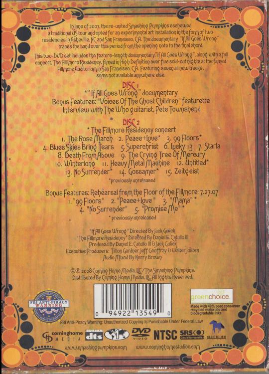If All Goes Wrong captures the re-united Smashing Pumpkins during their experimental 2007 Fillmore residency in San Francisco. This two-DVD set features a feature-length documentary chronicling the band's creative process and the development of new material, a full live concert filmed at the Fillmore Auditorium, and extensive bonus material including rehearsals, interviews, featurettes, and previously unreleased tracks.