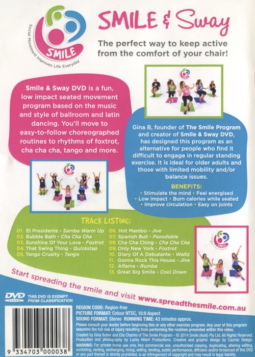 Smile & Sway DVD offers a delightful seated movement program designed to keep you active and energized right from the comfort of your chair! Led by Gina B, founder of The Smile Program, and creator of this innovative workout, you'll groove to the rhythms of ballroom and Latin dancing styles like foxtrot, cha cha cha, tango, and more. Each routine is choreographed to easy-to-follow steps, making it suitable for older adults and individuals with limited mobility or balance issues.