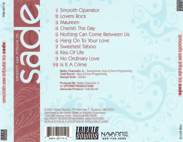 Smooth Sax Tribute To Sade MUSIC AUDIO CD smooth jazz 2005 Walter Chancellor Jr.