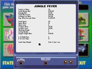 Players interested in tracking statistics can view their total number of bets, total amount of cash wagered, average bet, total dollars won or lost, the percentage of return on bets, and the average wins and losses per hour. Additional stats include total spins, number of spins won or lost, percentage of spins won or lost, longest winning and losing streaks, largest single win, number of high and low payoffs, and the total time invested in playing.