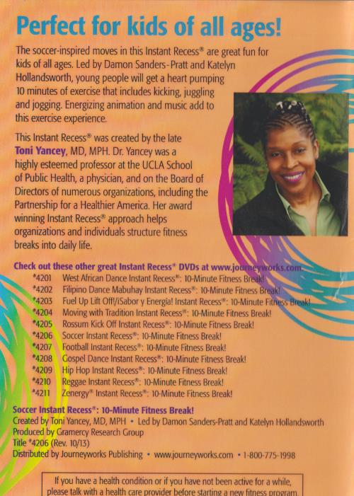 Perfect for kids of all ages! The soccer-inspired moves in this are great fun for kids of all ages. Led by Damon Sanders-Pratt and Katelyn Hollandsworth, young people will get a heart pumping 10 minutes of exercise that includes kicking, juggling and jogging. Energizing animation and music add to this exercise experience. This was created by the late Toni Yancey, MD, MPH. Dr. Yancey was a highly esteemed professor at the UCLA School of Public Health, a physician, and on the Board of Directors of numerous organizations, including the Partnership for a Healthier America. Her award winning approach helps organizations and individuals structure fitness breaks into daily life.