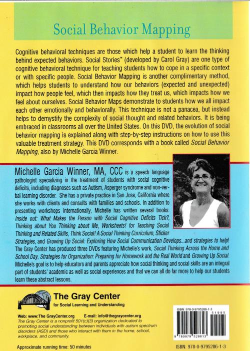 Social Behavior Mapping Cognitive behavioral techniques are those which help a student to learn the thinking behind expected behaviors. Social Stories (developed by Carol Gray) are one type of cognitive behavioral technique for teaching students how to cope in a specific context or with specific people. Social Behavior Mapping is another complimentary method, which helps students to understand how our behaviors (expected and unexpected) impact how people feel, which then impacts how they treat us, which impacts how we feel about ourselves. Social Behavior Maps demonstrate to students how we all impact each other emotionally and behaviorally. This technique is not a panacea, but instead helps to demystify the complexity of social thought and related behaviors. It is being embraced in classrooms all over the United States. On this DVD, the evolution of social behavior mapping is explained along with step-by-step instructions on how to use this valuable treatment strategy. This DVD corresponds with a book called Social Behavior Mannino. also by Michelle Garcia Winner. Michelle Garcia Winner, MA, CCC is a speech language pathologist specializing in the treatment of students with social cognitive deficits, including diagnoses such as Autism, Asperger syndrome and non-ver-bal learning disorder. She has a private practice in San Jose, California where she works with clients and consults with families and schools. In addition to presenting workshops internationally, Michelle has written several books: Inside out: What Makes the Person with Social Cognitive Deficits Tick?, Thinking about You Thinking about Me, Worksheets for Teaching Social Thinking and Related Skills, Think Social! A Social Thinking Curriculum, Sticker Strategies, and Growing Up Social: Exploring How Social Communication Develops...and strategies to help! The Gray Center has produced three DVDs featuring Michelle's work, Social Thinking Across the Home and School Day, Strategies for Organization: Preparing for Homework and the Real World and Growing Up Social. Michelle's goal is to help educators and parents appreciate how social thinking and social skills are an integral part of students' academic as well as social experiences and that we can all do far more to help our students learn these abstract lessons.