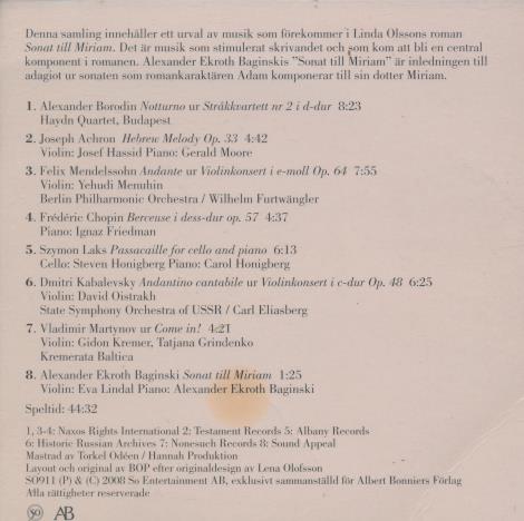 This compilation assembles selections of classical music featured in Linda Olsson’s novel Sonat till Miriam. The collection includes intimate piano and violin pieces as well as chamber and orchestral works that helped inspire the novel’s mood. Performances range from historic recordings by artists such as Yehudi Menuhin and the Berlin Philharmonic to contemporary contributions like Alexander Ekroth Baginski’s Sonat till Miriam. Overall, the album presents a quietly expressive classical programme suited to reflection and narrative accompaniment.