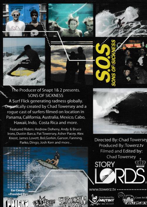 The producer of Snapt 1 & 2 surfing videos presents SONS OF SICKNESS, A Surf DVD Generating Radness Globally. Organically created by Chad Towersey and a rogue cast of surfers filmed on location in Panama, California, Australia, Mexico, Cabo, Hawaii, Indo, Costa Rica and more. Featured Riders: Andrew Doheney, Andy & Bruce Irons, Dustin Barca, Pat Towersey, Asher Pacey, Alex Knost, James Lovett, Bol, Gorkin, Fanning, Parko, Dingo, Josh Kerr and more….