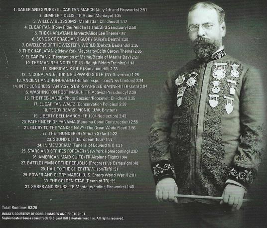 1. SABER AND SPURS / EL CAPITAN MARCH (July 4th and Fireworks) 2:51 2. SEMPER FIDEL'S (TR Action Montage) 1:35 3. WILLOW BLOSSOMS (Manhattan Childhood) 1:17 4. EL CAPITAN (Pony Ride/Pelican Island/Bird Sanctuary) 2:50 5. THE CHARLATAN (Harvard/Alice Lee Theme) :47 6. SONGS OF GRACE AND GLORY (Alice's Death) 1:30 7. DWELLERS OF THE WESTERN WORLD (Dakota Badlands) 3:36 8. THE CHARLATAN 2 (New York Mayoralty/Edith Carow Theme) 2.06 9. EL CAPITAN 2 (Destruction of Maine/Battle of Manila Bay) 2:21 10. THE MAN BEHIND THE GUN (Rough Riders Training) 1:41 11. SHERIDAN'S RIDE (San Juan Hill) 2:33 12. IN CUBALAND/LOOKING UPWARD SUITE (NY Governor) 1:26 13. ANCIENT AND HONORABLE (Buffalo Exposition/New Century) 2:24 14. INT'L CONGRESS FANTASY (STAR-SPANGLED BANNER) (TR Oath) 2:04 15. WASHINGTON POST MARCH (TR Activist Presidency) 2:29 16. THE FREE-LANCE (Photo Session/Roosevelt Children) 2:25 17. EL CAPITAN WALTZ (Conservation Policies) 2:38 18. TEDDY BEARS' PICNIC (J.W. Bratten) 19. LIBERTY BELL MARCH (TR 1904 Reelection) 2:43 20. PATHFINDER OF PANAMA (Panama Canal Construction) 2:56 21. GLORY TO THE YANKEE NAVY (The Great White Fleet) 2:56 22. THE THUNDERER (African Safari) 1:22 23. SOUND OFF (European Tour) 1:57 24. IN MEMORIAM (Funeral of Edward VII) 1:31 25. STARS AND STRIPES FOREVER (New York Homecoming) 2:07 26. AMERICAN MAID SUITE (TR Airplane Flight) 1:44 27. BATTLE HYMN OF THE REPUBLIC (Progressive Campaign) :40 28. HAIL TO THE CHIEF (TR/Wilson/Taft) :51 29. POWER AND GLORY MARCH (U.S. Enters World War I) 2:01 30. THE GOLDEN STAR (Death of TR) :59 31. SABER AND SPURS (TR Montage/Ending Fireworks) 1:40 Total Runtime: 63:26