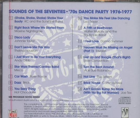 This Time Life compilation collects dance floor hits from 1976 and 1977. The collection showcases disco, funk, soul and pop crossover tracks that dominated US charts and clubs. Artists featured include KC and the Sunshine Band, Donna Summer, Commodores, Andy Gibb and more. The set captures the high energy, orchestral rhythms and synthesizer driven grooves of late 1970s dance music.