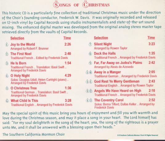 The Southern California Mormon Choir presents a program of traditional Christmas carols performed in full choral style under the direction of founding conductor Frederick W. Davis. The recordings feature studio instrumentalists and a classic mid-century production aesthetic, originally issued on 12-inch vinyl by Capital Records. This release was digitally enhanced from the original analog stereo master tapes retrieved from the vaults of Capital Records to preserve the choir's rich, warm sound. Soloists are featured on several tracks and the arrangements range from intimate organ-accompanied hymns to full, festive choral settings.