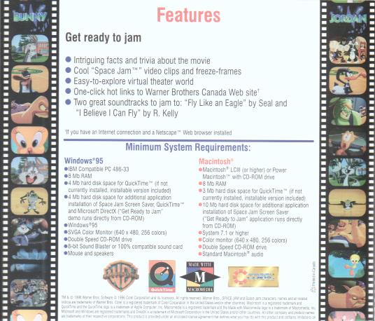 Includes 2 great hits from the original soundtrack by Seal and R. Kelly! - a Special Space Jam preview CD-ROM developed for Warner Bros. • Features Get ready to jam • Intriguing facts and trivia about the movie • Cool "Space Jam®" video clips and freeze-frames • Easy-to-explore virtual theater world • Two great soundtracks to jam to: "Fly Like an Eagle" by Seal and "I Believe I Can Fly" by R. Kelly