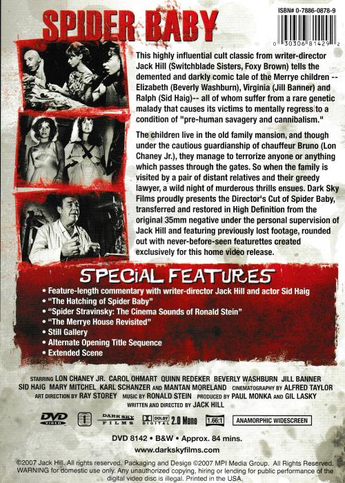 Dark Sky Films proudly presents the Director's Cut of Spider Baby, transferred and restored in High Definition from the original 35mm negative under the personal supervision of Jack Hill and featuring previously lost footage, rounded out with never-before-seen featurettes created.
