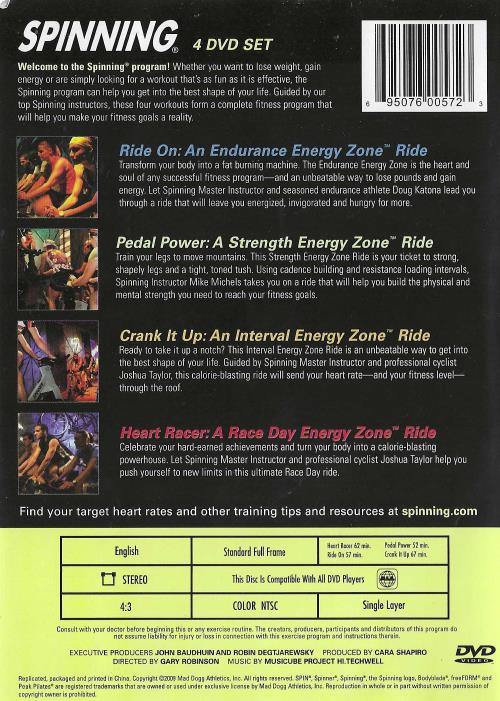 Welcome to the Spinning program! Whether you want to lose weight, gain energy or are simply looking for a workout that's as fun as it is effective, the Spinning program can help you get into the best shape of your life. Guided by our top Spinning instructors, these four workouts form a complete fitness program that will help you make your fitness goals a reality. Features Ride On: An Endurance Energy Zone Ride, Pedal Power: A Strength Energy Zone Ride, Crank It Up: An Interval Energy Zone Ride, and Heart Racer: A Race Day Energy Zone Ride