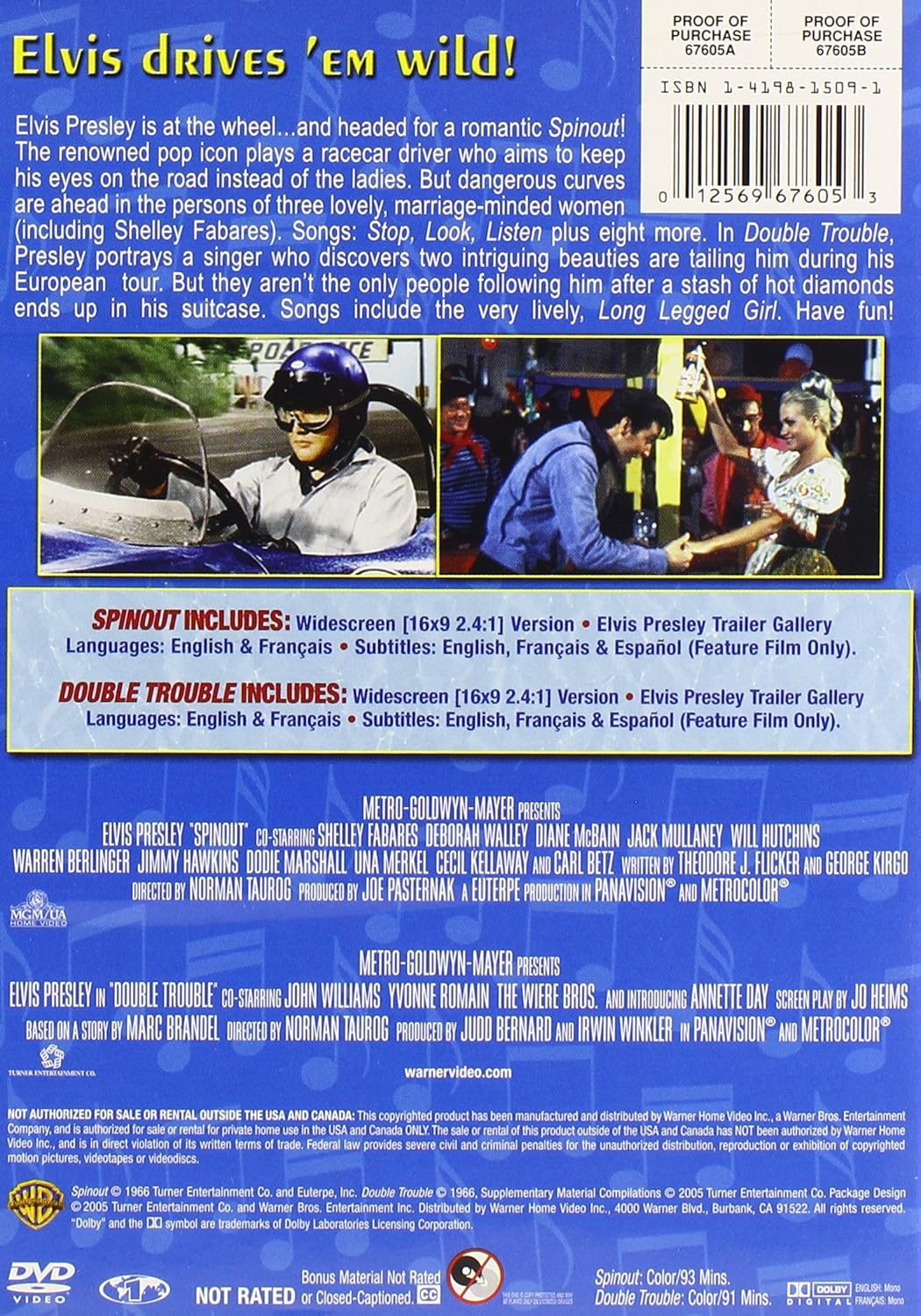 Elvis Presley is at the wheel and headed for a romantic Spinout! The renowned pop icon plays a racecar driver who aims to keep his eyes on the road instead of the ladies. But dangerous curves are ahead in the persons of three lovely, marriage-minded women (including Shelly Fabares). Songs: Stop, Look, Listen plus eight more. In Double Trouble, Presley portrays a singer who discovers two intriguing beauties are tailing him during his European tour. But they aren't the only people following him after a stash of hot diamonds ends up in his suitcase. Songs include the very lively, very Elvis Long Legged Girl. Have fun!