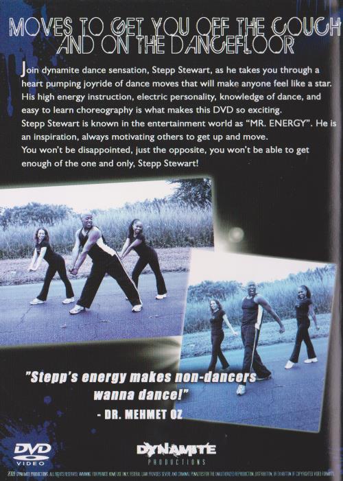 Stepp With Me: Cardio Dance WorkoutJoin dynamite dance sensation, Stepp Stewart, as he takes you through a heart pumping joyride of dance moves that will make anyone feel like a star. His high energy instruction, electric personality, knowledge of dance, and easy to learn choreography is what makes this DVD so exciting. Stepp Stewart is known in the entertainment world as "MR. ENERGY". He is an inspiration, always motivating others to get up and move. You won't be disappointed, just the opposite, you won't be able to get enough of the one and only, Stepp Stewart! "Slepp's energy makes non-dancers MUMS dance!"